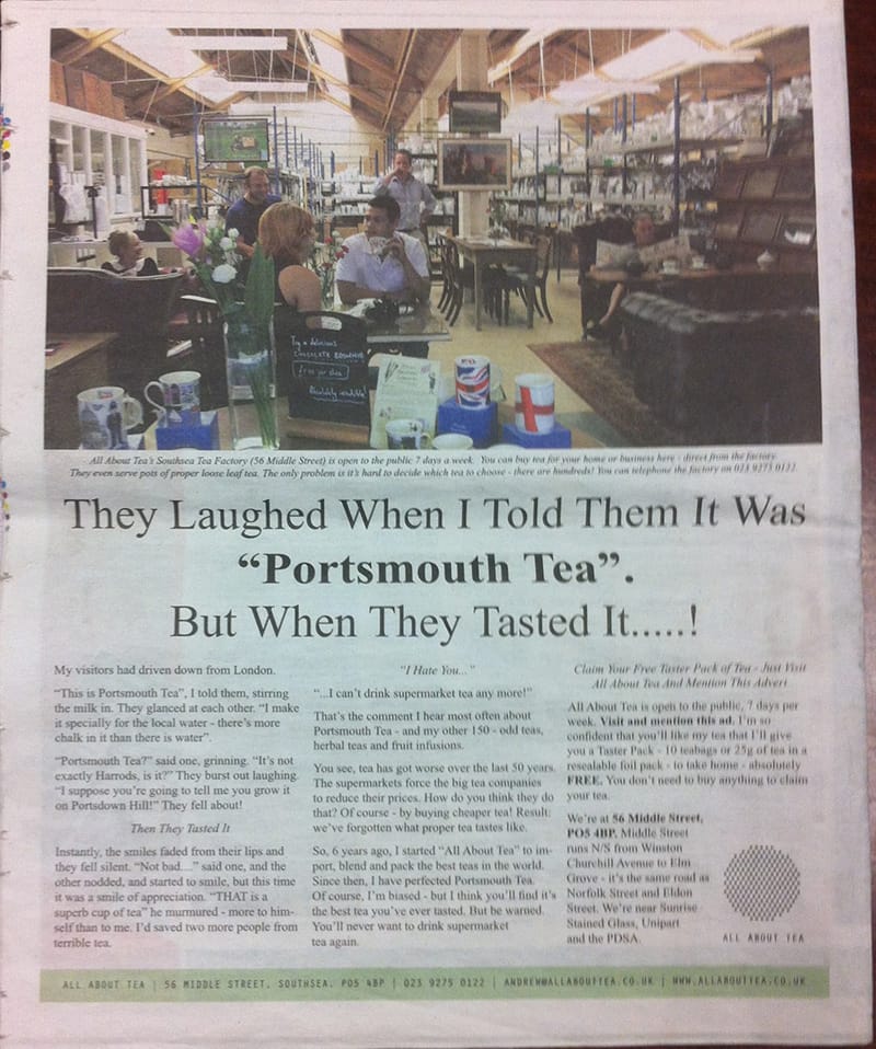 “Portsmouth Tea?” said one, grinning. “It’s not exactly Harrods, is it?”. They burst out laughing. “I suppose you’re going to tell me you grow it on Portsdown Hill!” They fell about!